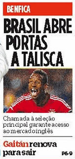 Anderson Talisca, acaba de ser convocado para selecção A do Brasil e há logo um jornal amigalhaço do Benfica, e muito à frente de todos os outros, que já vê uma porta a abrir-se para mais um grande negócio, antecipando imediatamente a entrada de muitos milhões de euros com a sua possível venda para o campeonato inglês, de onde têm chegado ecos de que desde tenra idade (talvez desde os 20 anos) o jovem jogador vem sendo observado por uma equipa treinada por um treinador português... Mais um grande negócio em perspectiva...